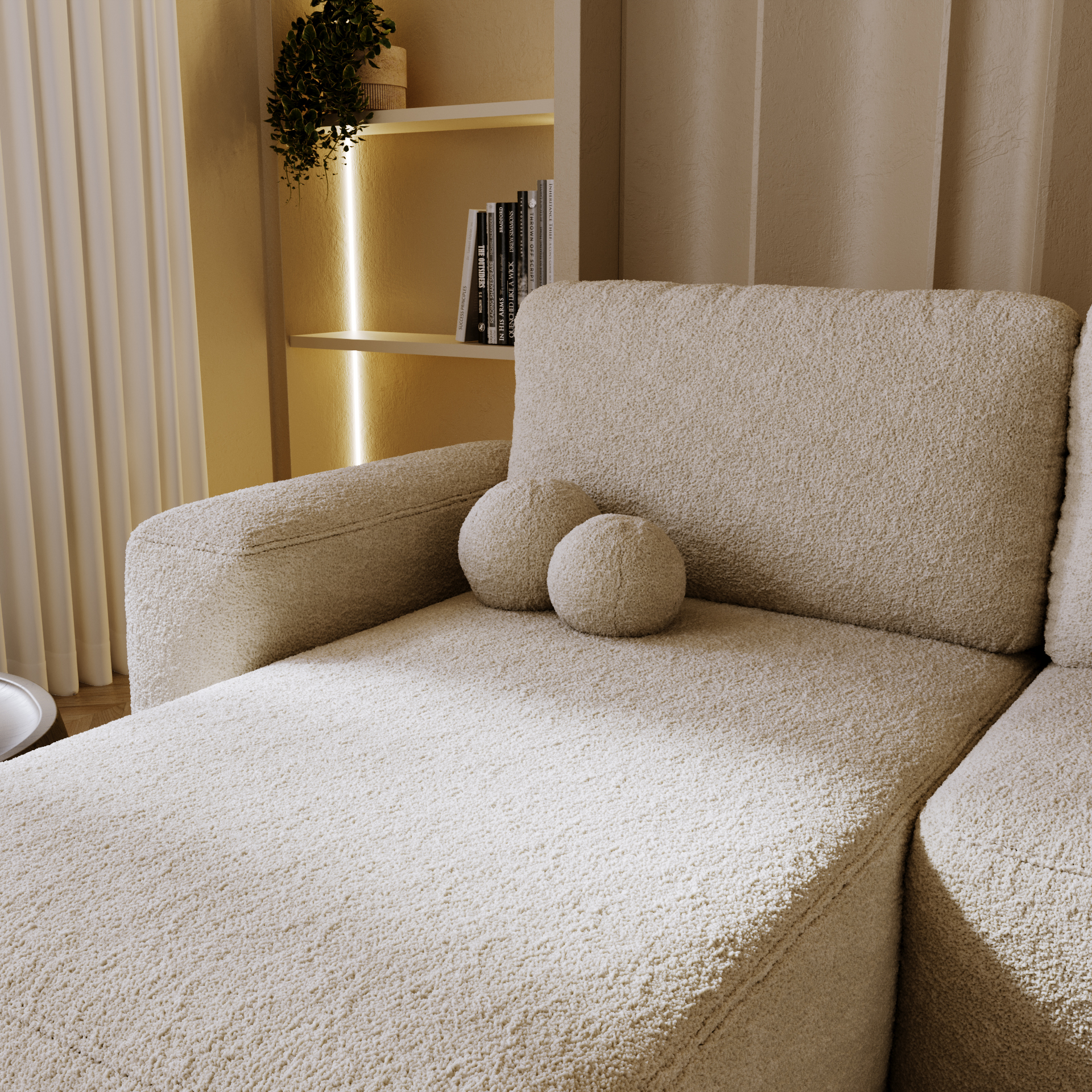 Umgås är en stilren U-formad bäddsoffa, klädd i trendigt bouclétyg och skapad för att samla människor och göra vardagen enklare. Den generösa U-formen skapar en naturlig plats för umgänge, vila och avkoppling – perfekt för långa kvällar, familjeliv och sociala stunder.