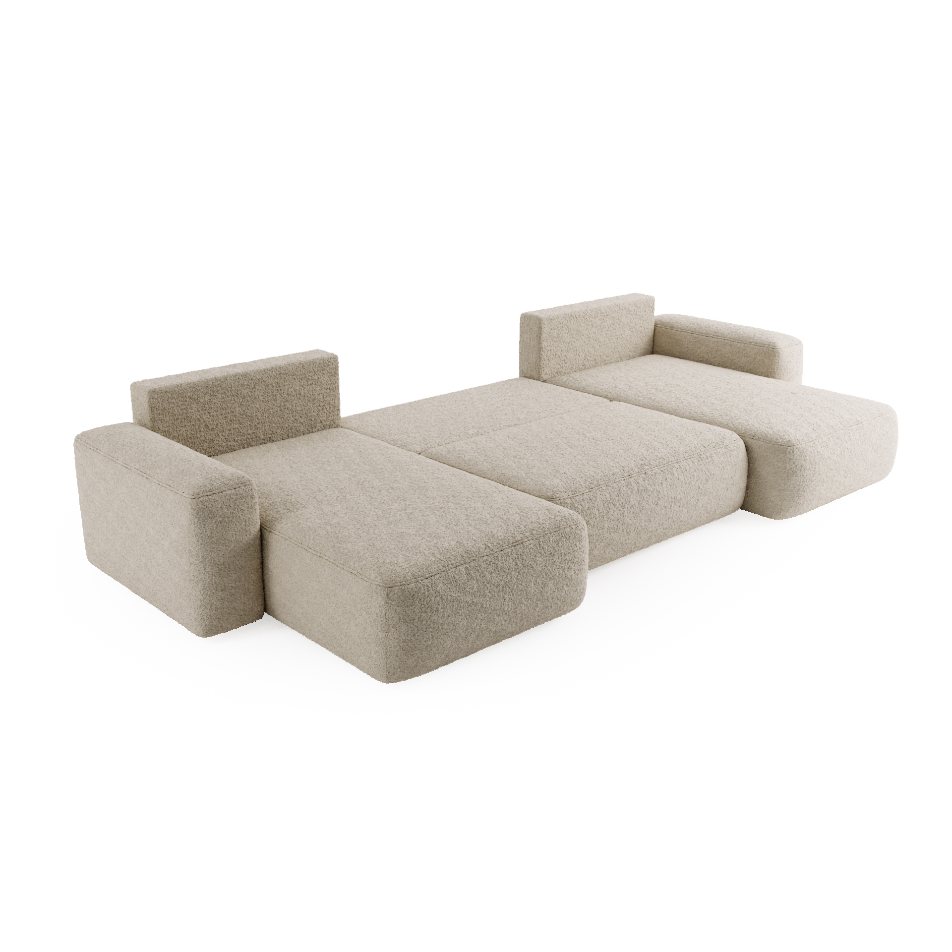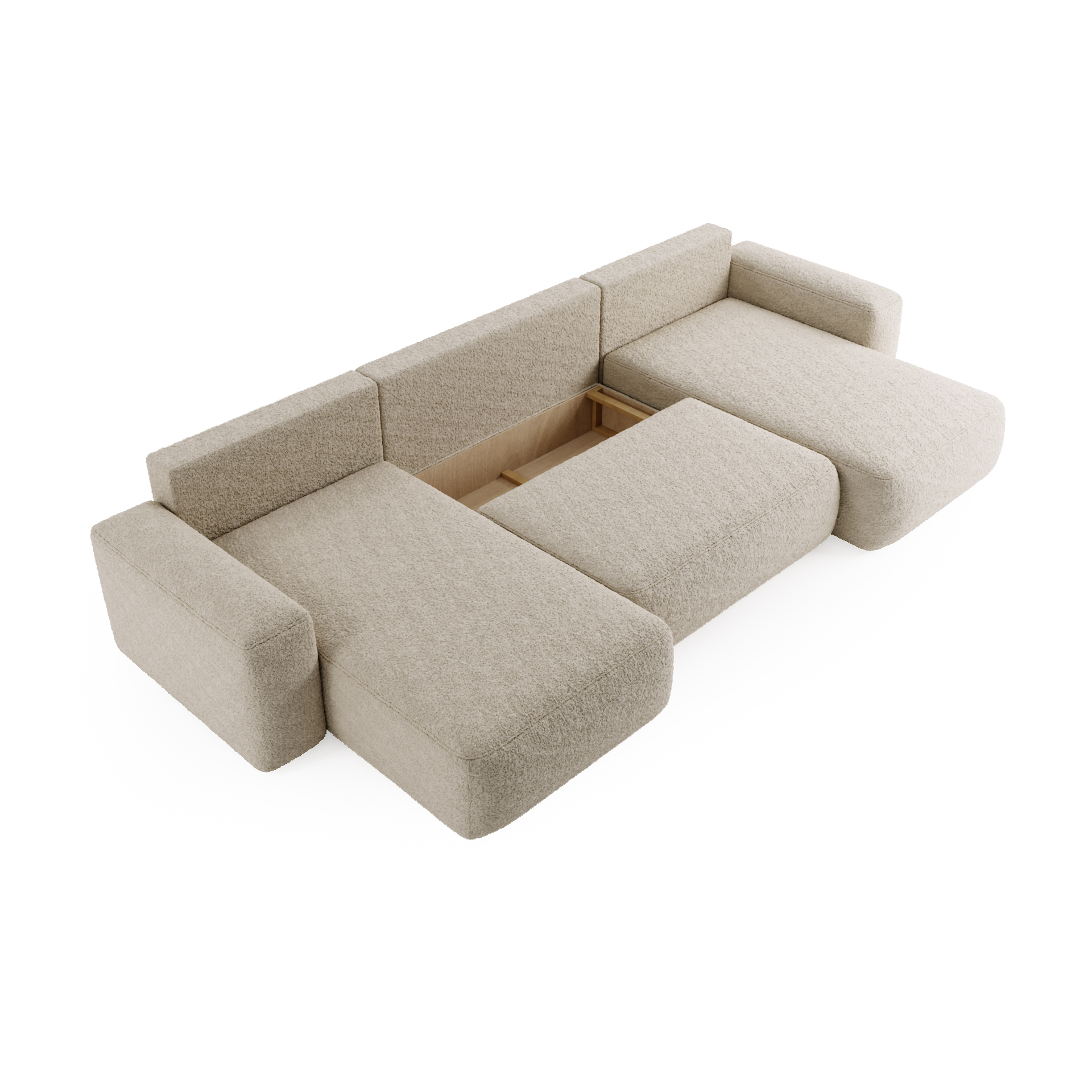Umgås – En U-formad bäddsoffa med förvaring i bouclétyg